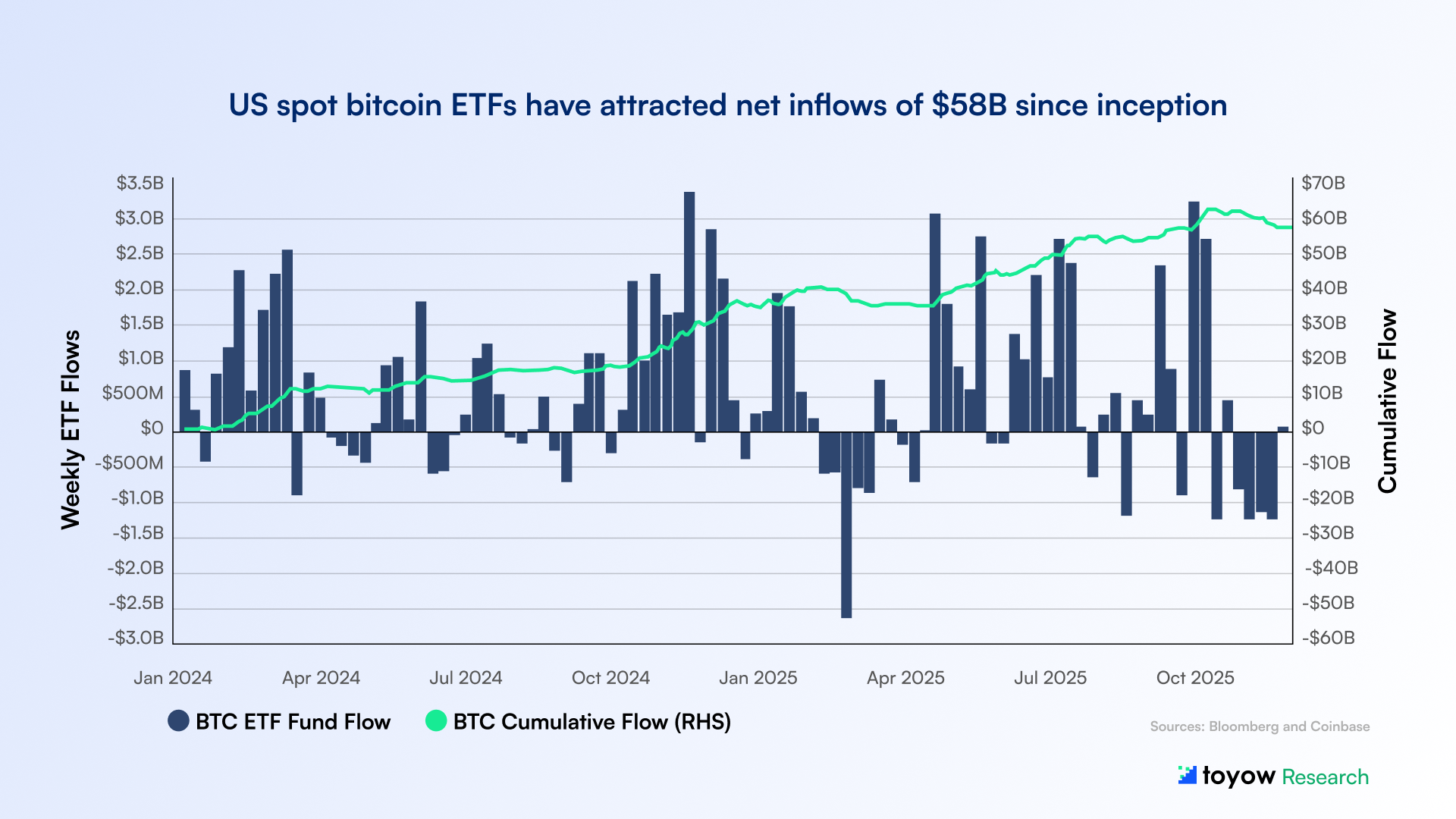 - Institutional Infrastructure: Bitcoin spot ETF cumulative net inflows $57.9B since launch; AUM $150.8B