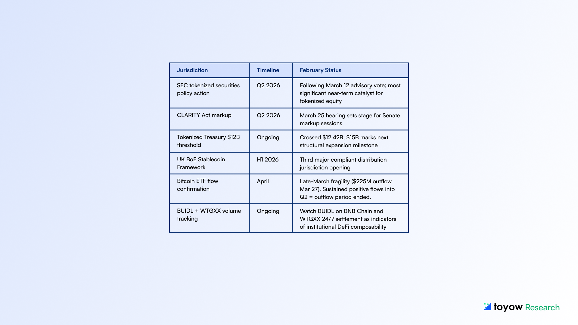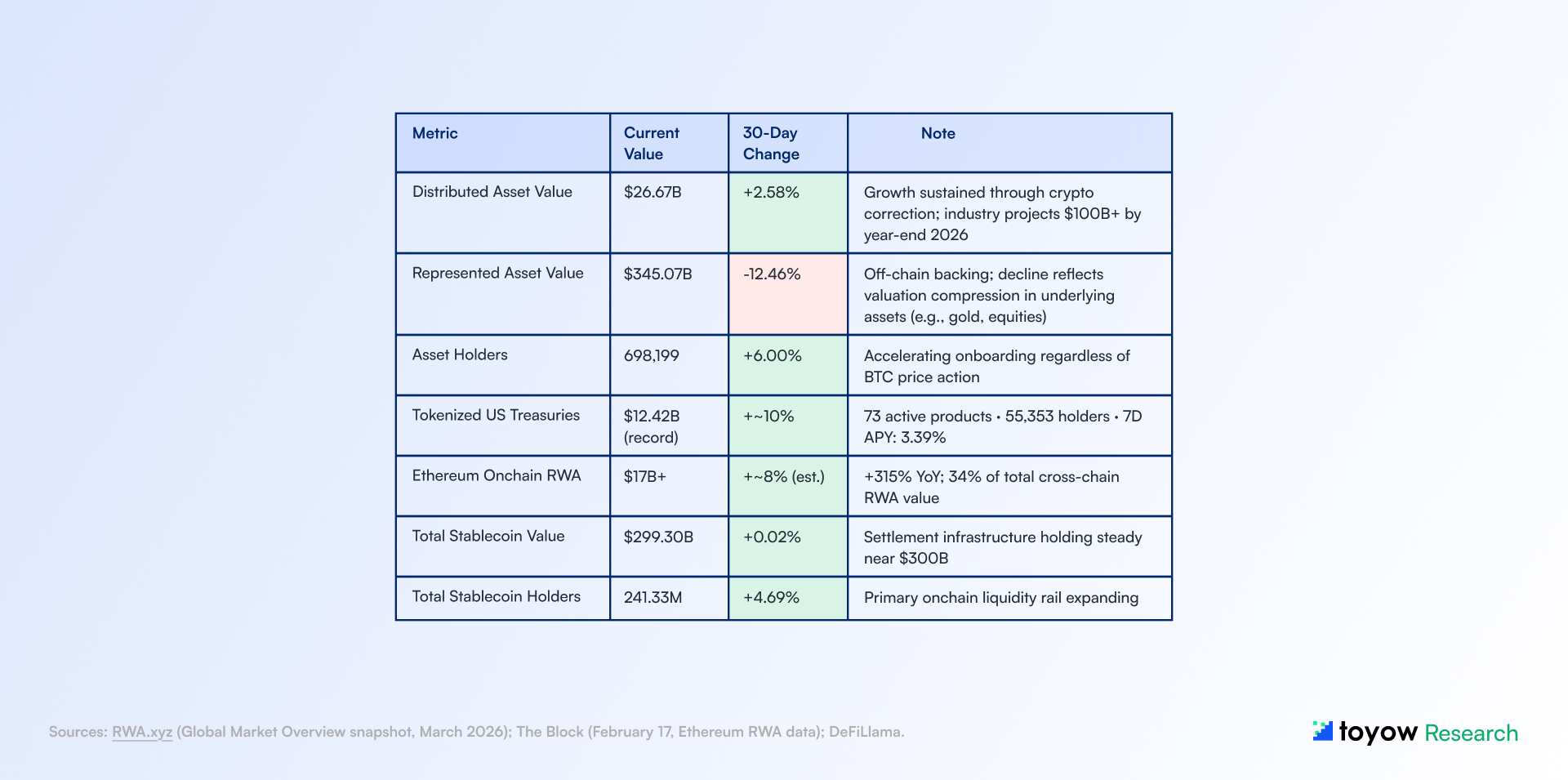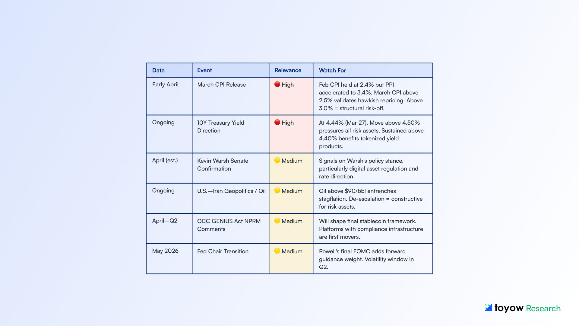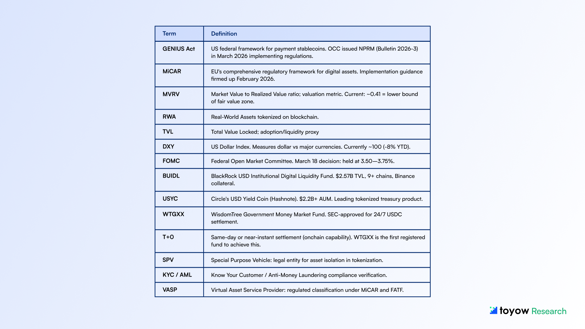 This report synthesizes publicly available information from onchain analytics platforms, regulatory publications, central bank communications, and market data sources believed to be reliable as of March 29, 2026. Toyow does not guarantee accuracy, completeness, or timeliness of the information contained herein.