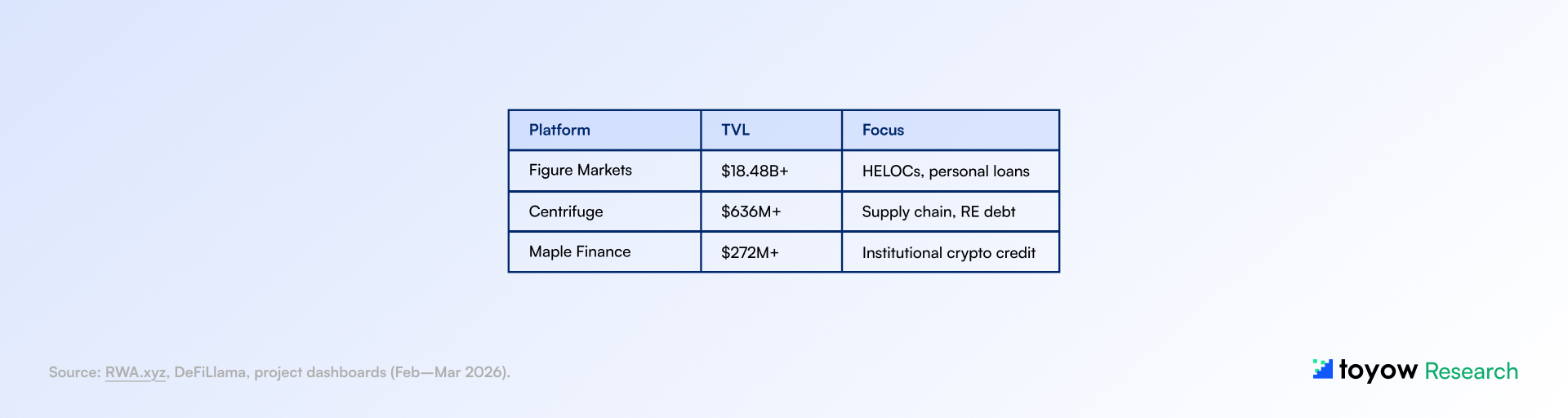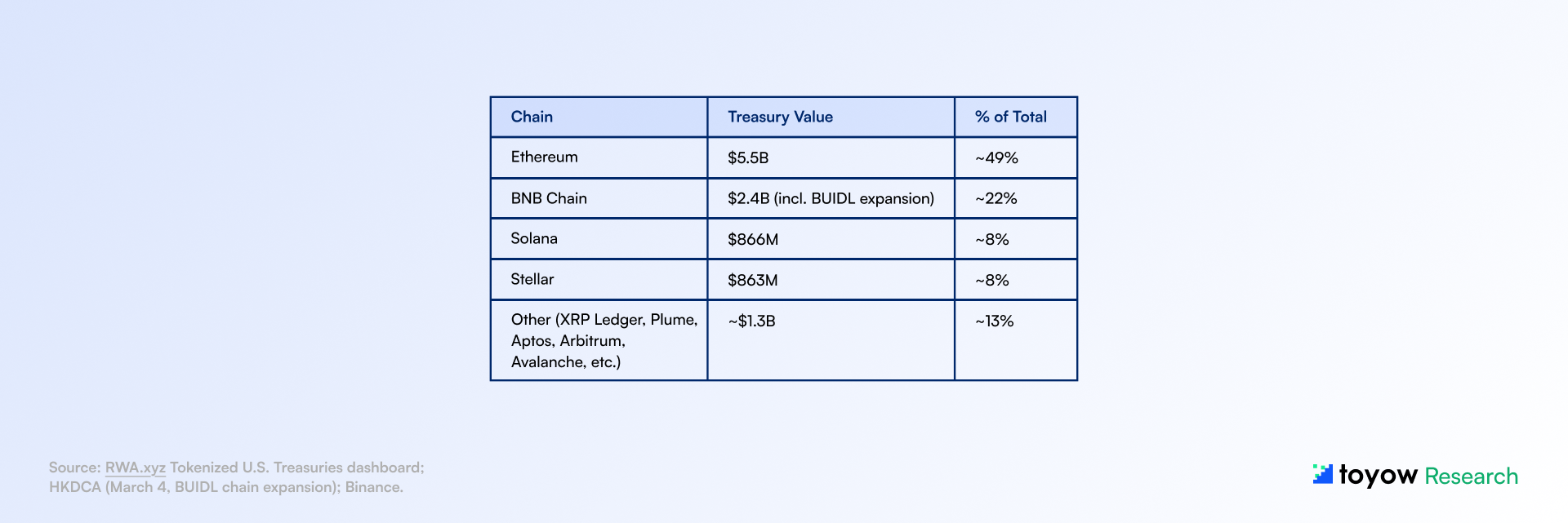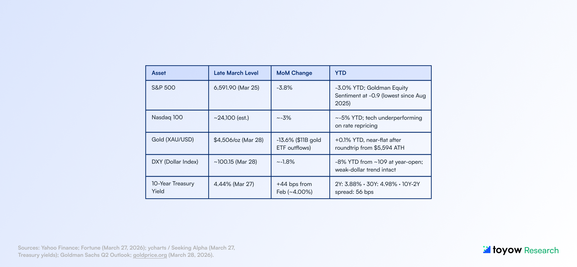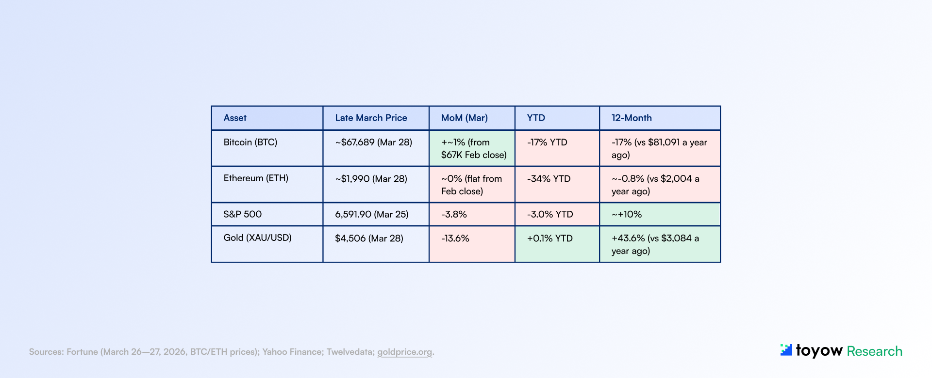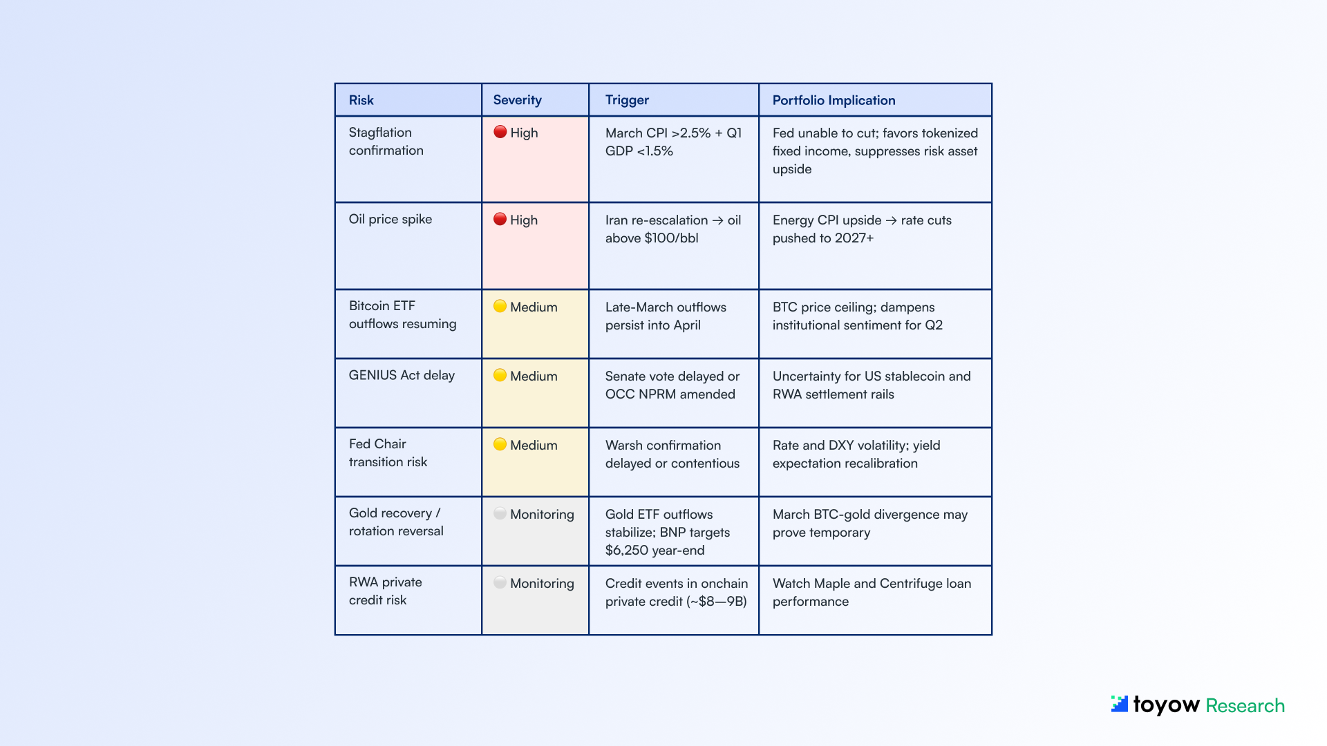 This report synthesizes publicly available information from onchain analytics platforms, regulatory publications, central bank communications, and market data sources believed to be reliable as of March 29, 2026. Toyow does not guarantee accuracy, completeness, or timeliness of the information contained herein.