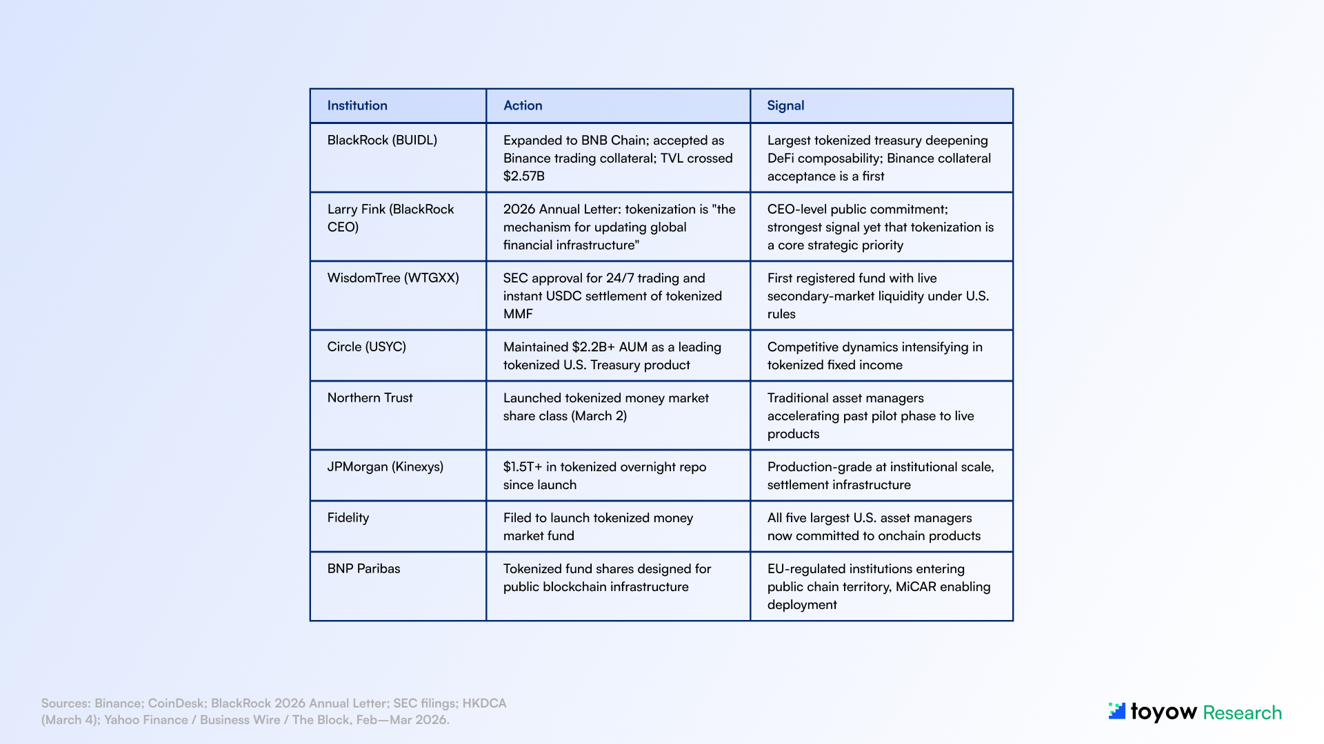 - Larry Fink 2026 Annual Letter (BlackRock): Explicitly described tokenization as "the mechanism for updating global financial infrastructure", strongest CEO-level public commitment from the world's largest asset manager ($11.6T AUM)