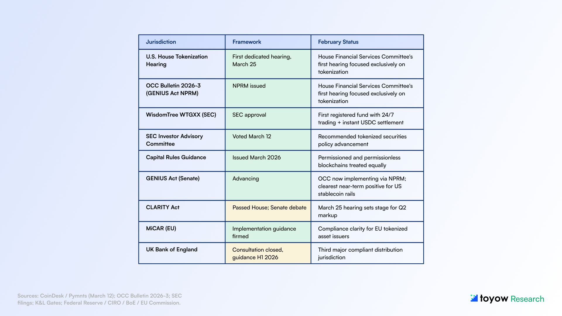- Regulatory momentum intensified. The U.S. House Financial Services Committee held its first dedicated tokenization hearing (March 25). The OCC issued Bulletin 2026-3, a GENIUS Act NPRM. WisdomTree received SEC approval for 24/7 USDC settlement of its tokenized MMF (WTGXX), the first registered fund with live secondary-market liquidity under U.S. rules.
