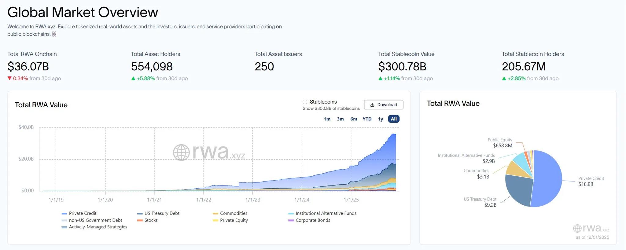 - Total RWA TVL: ~$36.07B